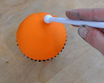 The cupcakes are SO easy. Just cut out a round of orange fondant with a large biscuit cutter (again about 1/8" thick) and slap it on a cupcake.