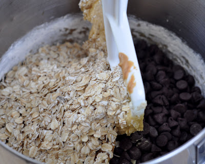 Add half of the oats, all of the peanut butter, and the chocolate chips. Mix until combined.