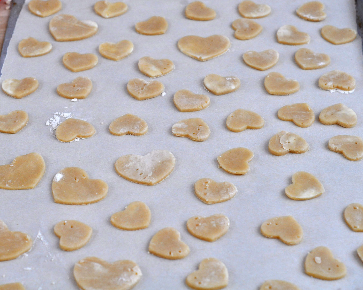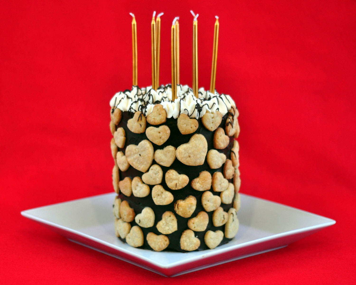 For the pie crust, I chose to roll the dough out and use a small heart-shaped cutter to make pieces to attach to the outside of the cake. I would recommend using a cutter that is 1" or smaller because of the curve of the cake. If they're too big, they're hard to get to stick to the cake without cracking and crumbling.
