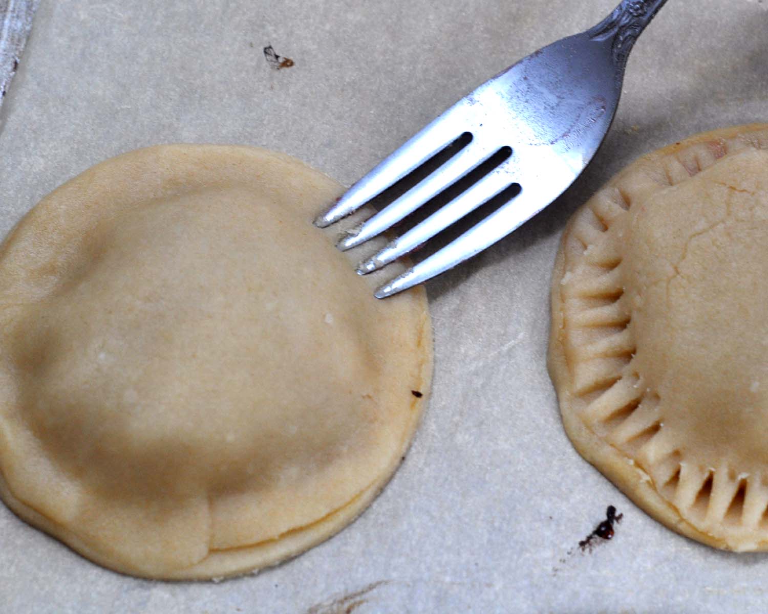 Use a fork to gently press to make a decorative edge. This also serves as a better way to seal the edges to keep the filling from leaking out while it bakes.