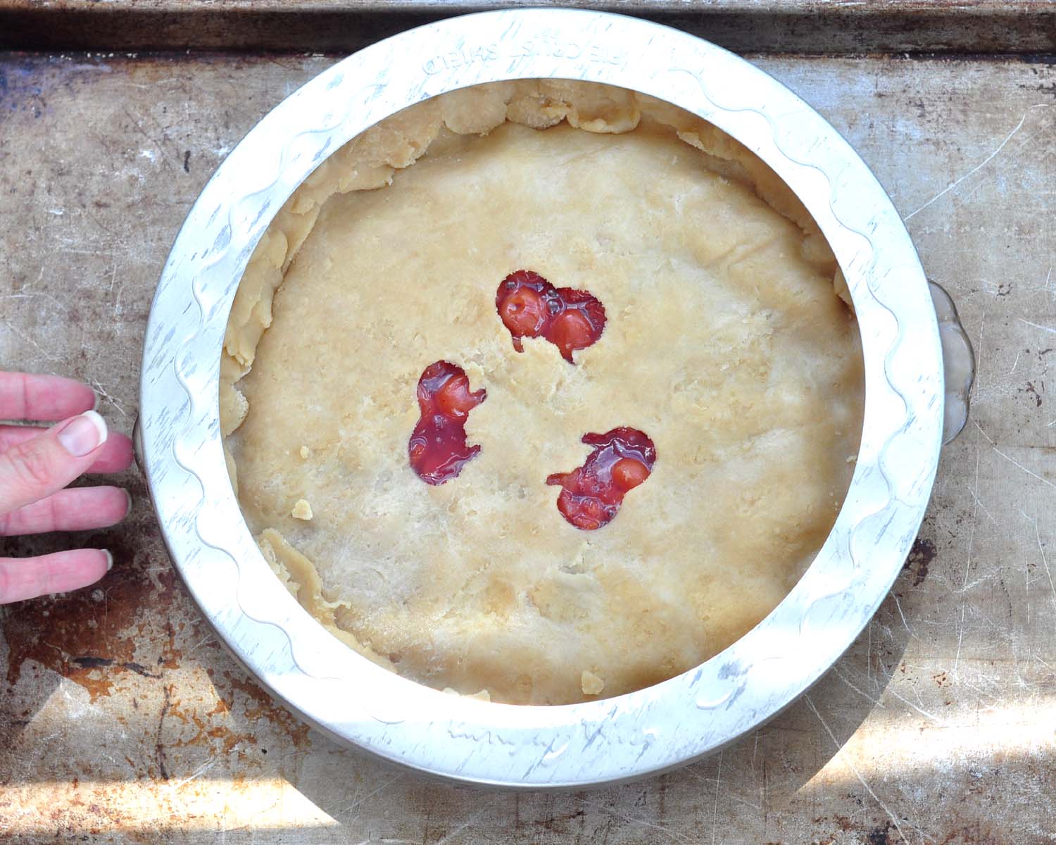 Bake the pie on a rimmed baking sheet. I use a Pie Shield to keep the edges from getting over-browned. You can also wrap foil around the edges to achieve the same thing. (It's just a little more work.)