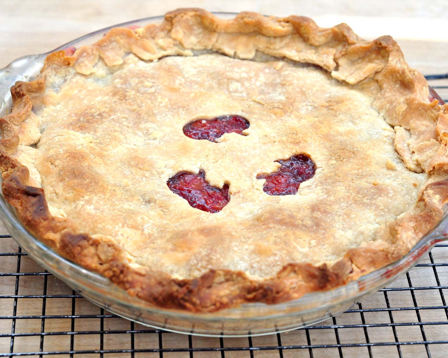 The pie will bake for about 45-55 minutes at 425-degrees (F). Remove the pie to a cooling rack, and cool for at least an hour before serving. (You never want to cool the pie right on the counter, it needs air on the bottom too, or the bottom crust can get gummy.)