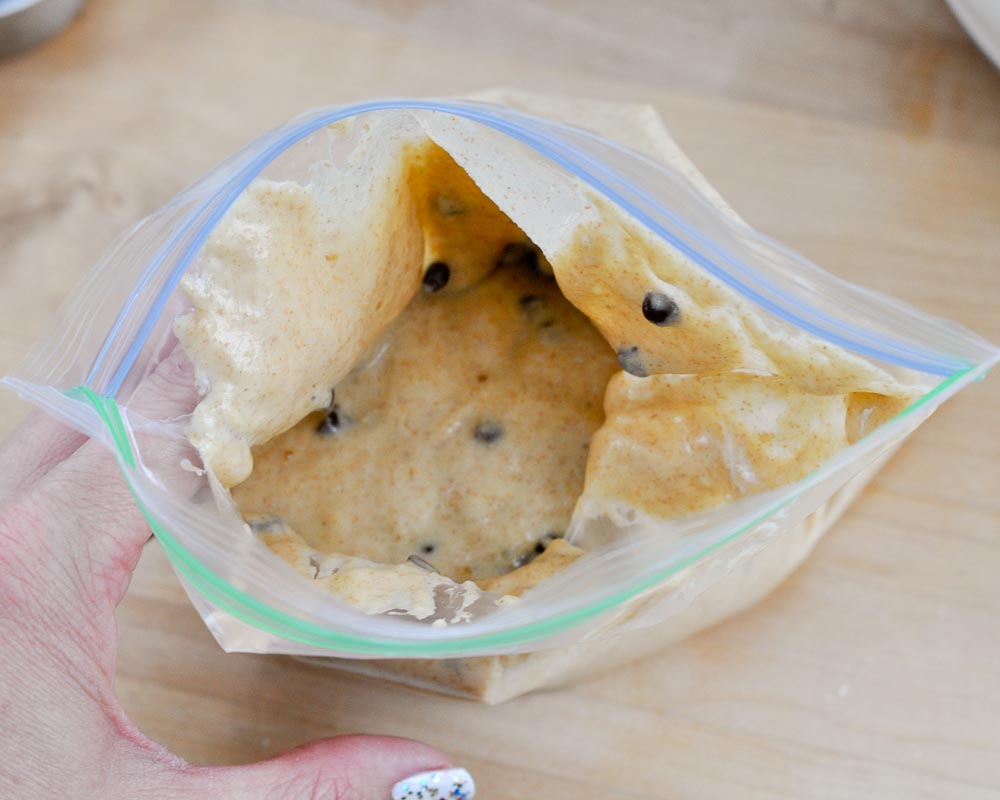 Pour/spoon the batter into a quart-sized zip-top baggie. (You can see that I added 1/4 cup mini chocolate chips to these.)